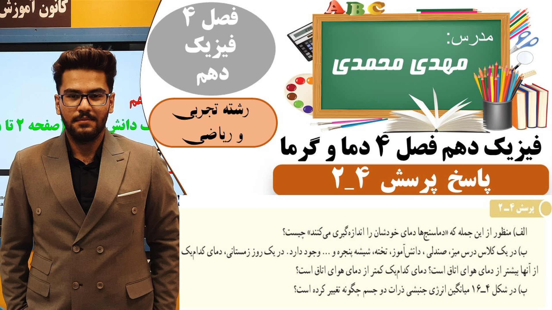 در این ویدئو به حل تشریحی و گام به گام پرسش 4_2 فصل چهارم فیزیک دهم (صفحه 96 کتاب درسی) میپردازیم. این تمرین مربوط به مقیاسهای متفاوت دما است و برای دانشآموزان رشته تجربی و ریاضی کاملاً قابل استفاده است. در این ویدئو به آموزش کامل فصل ۴ فیزیک دهم (دما و گرما) همراه با حل تشریحی تمرینها و پرسشهای کتاب درسی فیزیک دهم رشته تجربی و ریاضی میپردازیم. تمام مباحث مهم این فصل شامل مقیاسهای مختلف دما (سلسیوس، کلوین، فارنهایت)، ظرفیت گرمایی، گرمای ویژه، تعادل گرمایی و انبساط مواد به زبان ساده و روان توضیح داده شده است. این آموزش برای آمادگی امتحانات مدرسه، امتحانات نهایی و تستهای کنکور بسیار مفید است و شامل نکات کلیدی و روشهای سریع حل سوالات است. اگر به دنبال یک منبع رایگان و جامع برای آموزش و حل تمرینهای فیزیک دهم فصل ۴ دما و گرما هستید، حتما این مجموعه را ببینید. تمام تمرینها و مثالهای کتاب فیزیک دهم + نکات تستی و امتحانی + حل مسائل ترکیبی در این مجموعه به طور کامل بررسی شده است. این ویدئو مخصوص دانشآموز