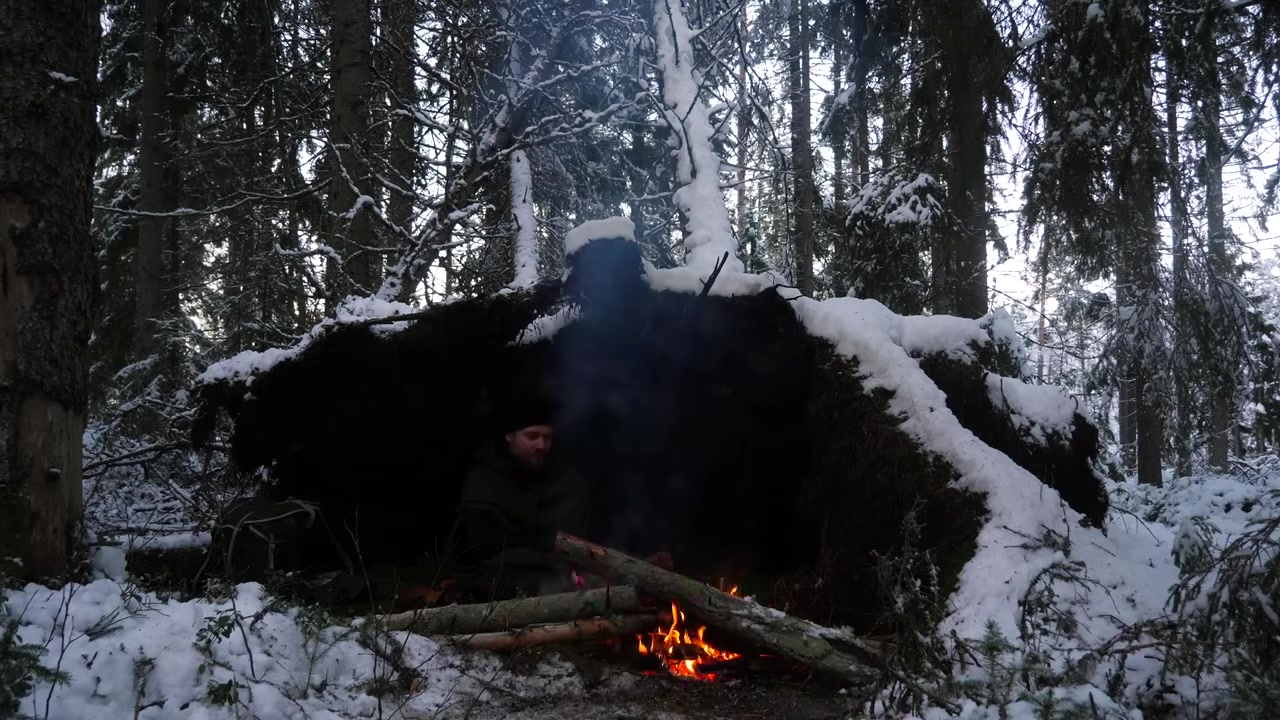 کمپینگ بقا و ساخت پناهگاه بوشکرفت در یک روز برفی در جنگل آشپزی در طبیعت
