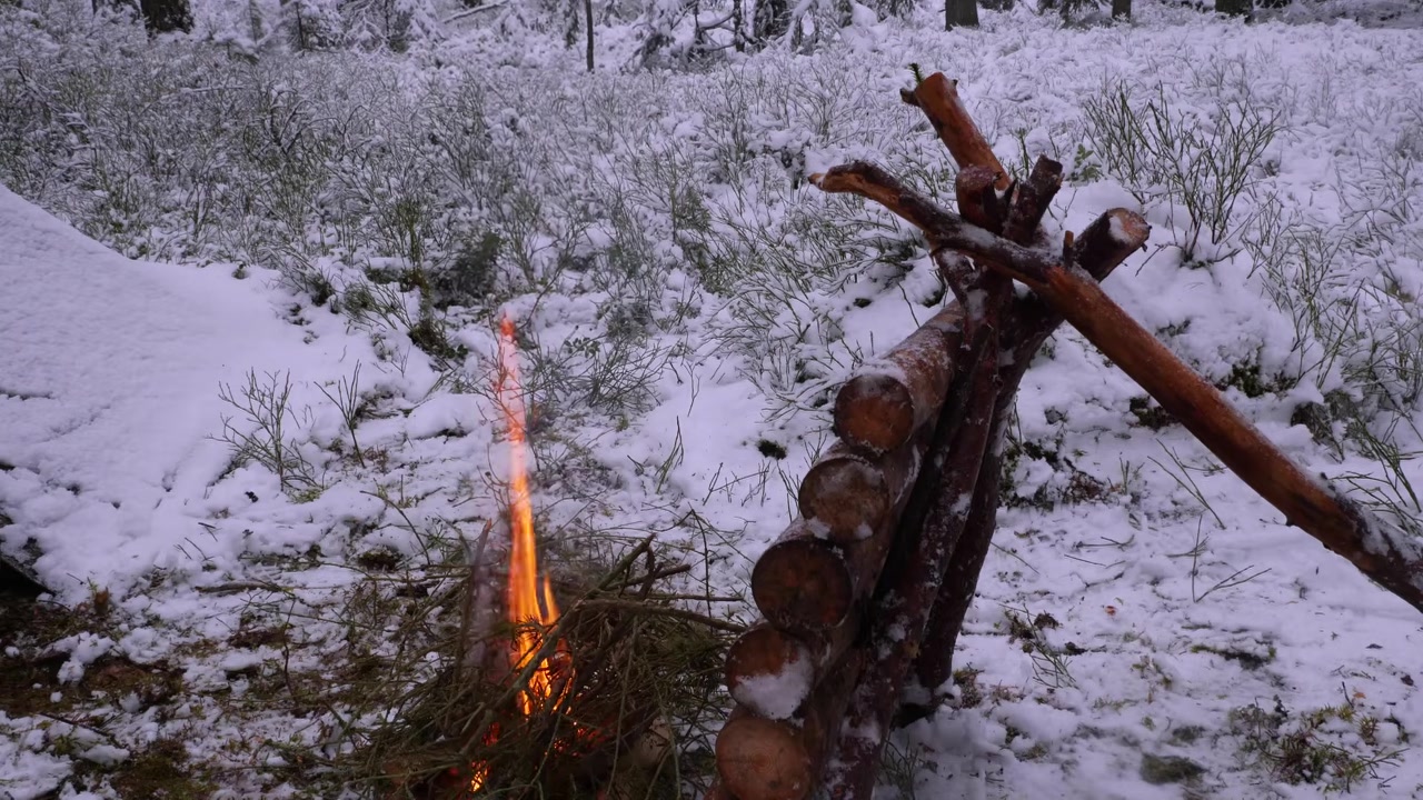 کمپینگ بوشکرفت و ساخت پناهگاه برای اقامت شبانه روز در جنگل های برفی در کنار دریاچه آشپزی در طبیعت