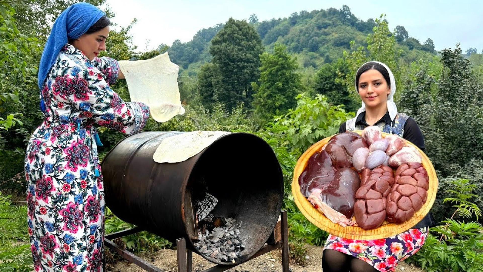 پخت اندام های داخلی گاو و گوسفند و پخت نان لواش روی بشکه زندگی روستایی جگر دل و قلوه نان محلی آشپزی روستایی غذای سالم