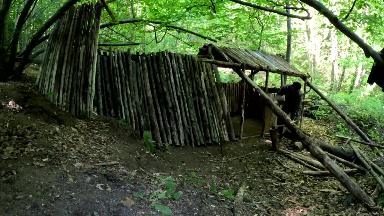 کمپینگ بوشکرفت و ساخت یک کلبه چوبی اسرار آمیز و زیبا با شاخ و برگ درختان و تنه های افتاده روی زمین در یک جنگل سرسبز و زیبا در شمال کشور طبیعتگردی و آشپزی در طبیعت