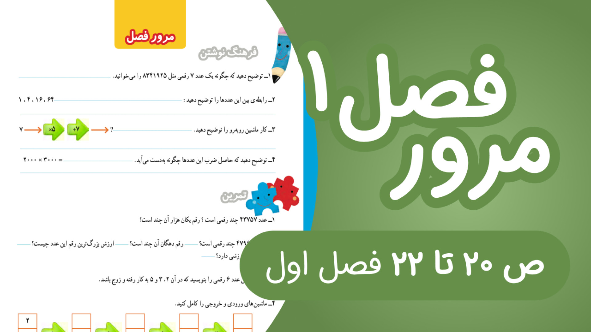 فصل اول تمام شد و میریم که مرور فصل رو شروع کنیم. در این ویدیو خانم خیاط صفحات20 تا 22 کتاب ریاضی رو برامون حل میکنن و توضیح میدن. پس ویدیو رو با دقت تماشا کنین و اگر براتون سوالی پیش اومد میتونین برامون در قسمت کامنت ها بگین. راستی، برای اینکه تمام ویدیوهای کتاب ریاضی چهارم رو بتونین صفحه به صفحه ببینین میتونین کانال مدرسه نارنگی رو دنبال کنین!