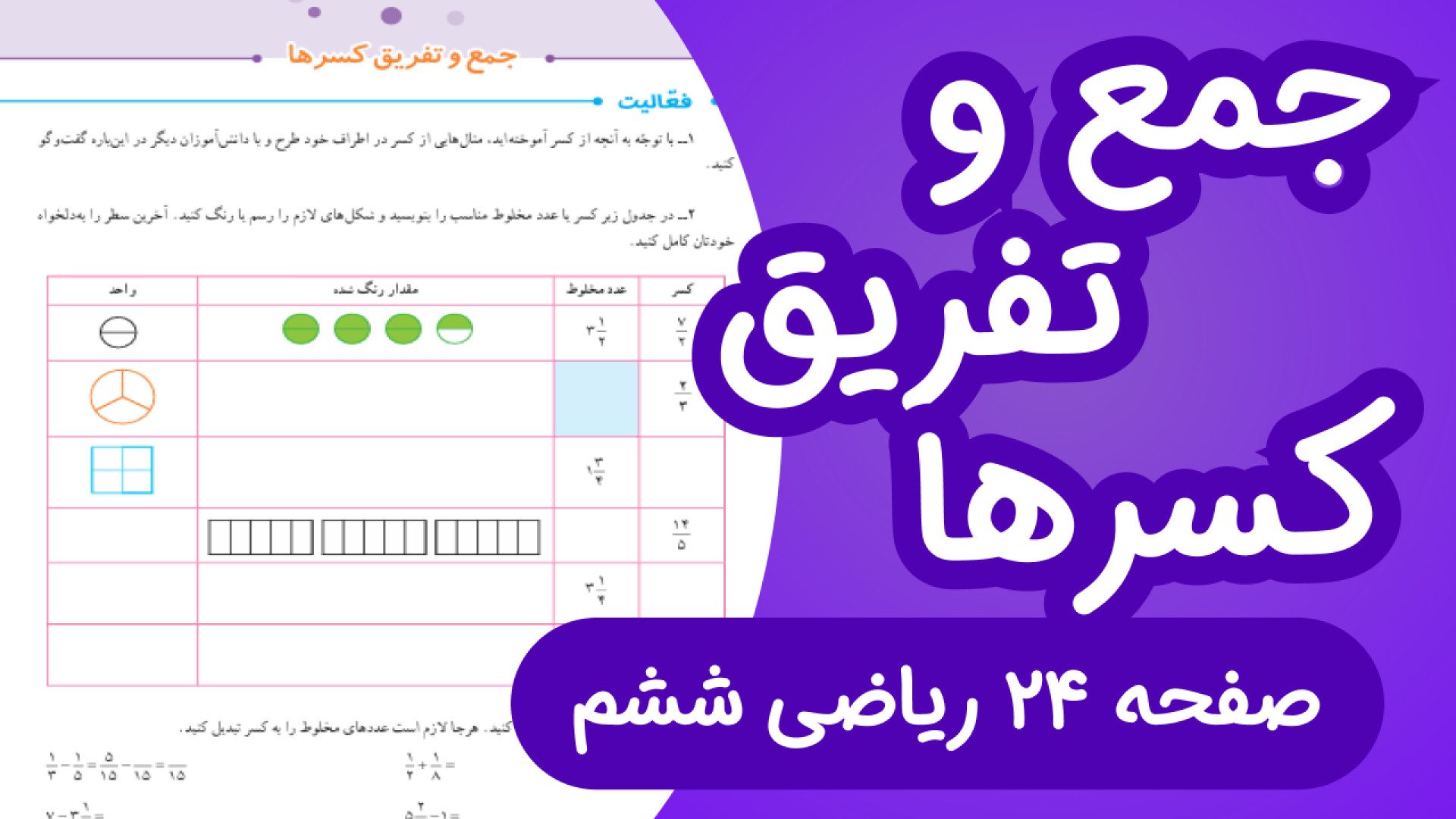 در این ویدیو از مدرسه نارنگی خانم رحمانی عزیز مبحث جمع و تفریق کسرها رو شروع میکنن و تمام نکات مهم فعالیت صفحه 24 رو توضیح میدن. پس ویدیو رو با دقت تماشا کنین و اگر براتون سوالی پیش اومد برامون در قسمت کامنت ها بنویسین. راستی، برای اینکه تمام ویدیوهای کتاب ریاضی ششم رو بتونین صفحه به صفحه ببینین میتونین کانال مدرسه نارنگی رو دنبال کنین!