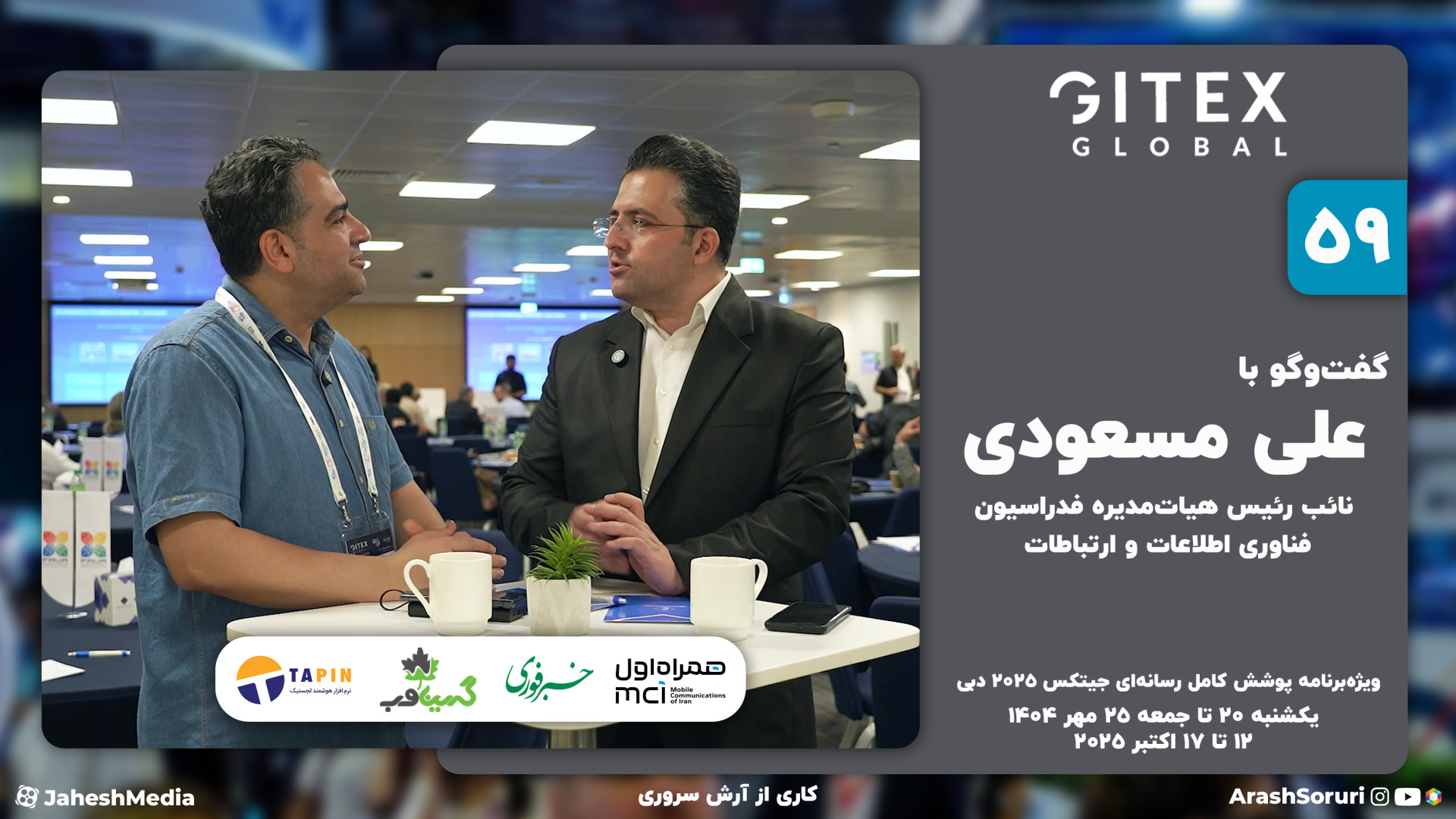 ویژهبرنامه پوشش کامل رسانهای جیتکس 2025 دبی کاری از آرش سروری با حمایت: mci.ir tapin.ir greenweb.ir khabarfoori.com در این قسمت گفتوگویی داریم با علی مسعودی نائب رئیس هیاتمدیره فدراسیون فناوری اطلاعات و ارتباطات