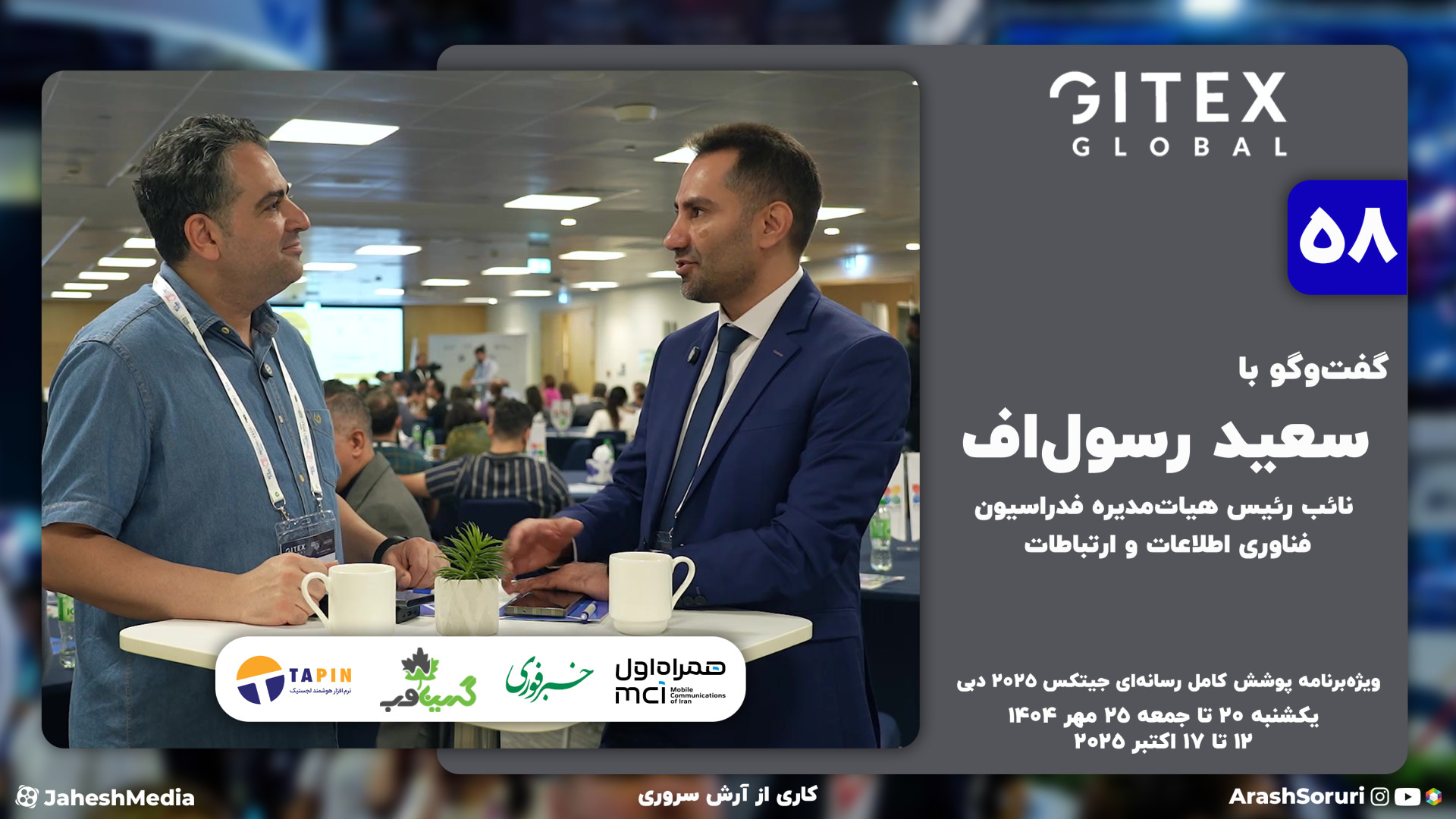 ویژهبرنامه پوشش کامل رسانهای جیتکس 2025 دبی کاری از آرش سروری با حمایت: mci.ir tapin.ir greenweb.ir khabarfoori.com در این قسمت گفتوگویی داریم با سعید رسولاف، نائب رئیس هیاتمدیره فدراسیون فناوری اطلاعات و ارتباطات