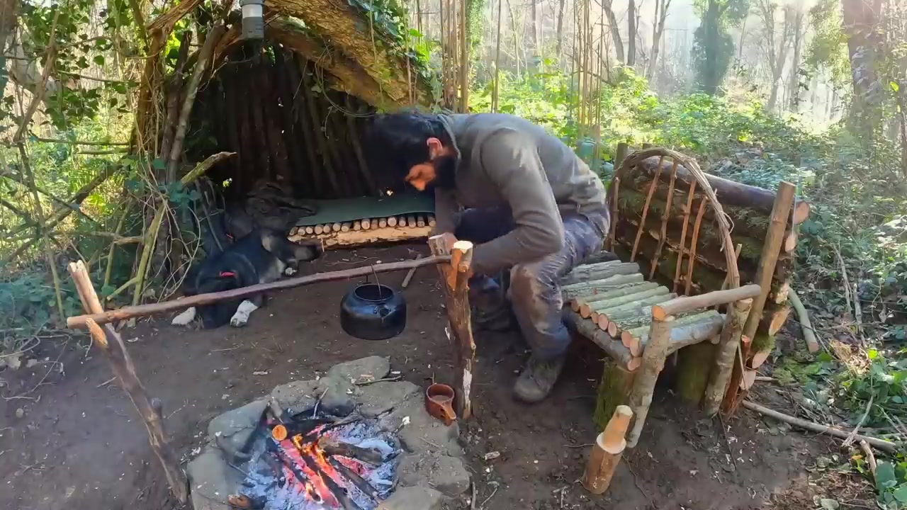 کمپینگ بقا و ساخت کلبه چوبی از شاخ و برگ درختان در جنگل به همراه سگم شیدو ساخت تخت و صندلی چوبی شگفت انگیز در کمپ که از دیدن آن حیرت زده خواهید شد کباب گوشت قرمز برای نهار و پخت املت انگلیسی برای صبحانه