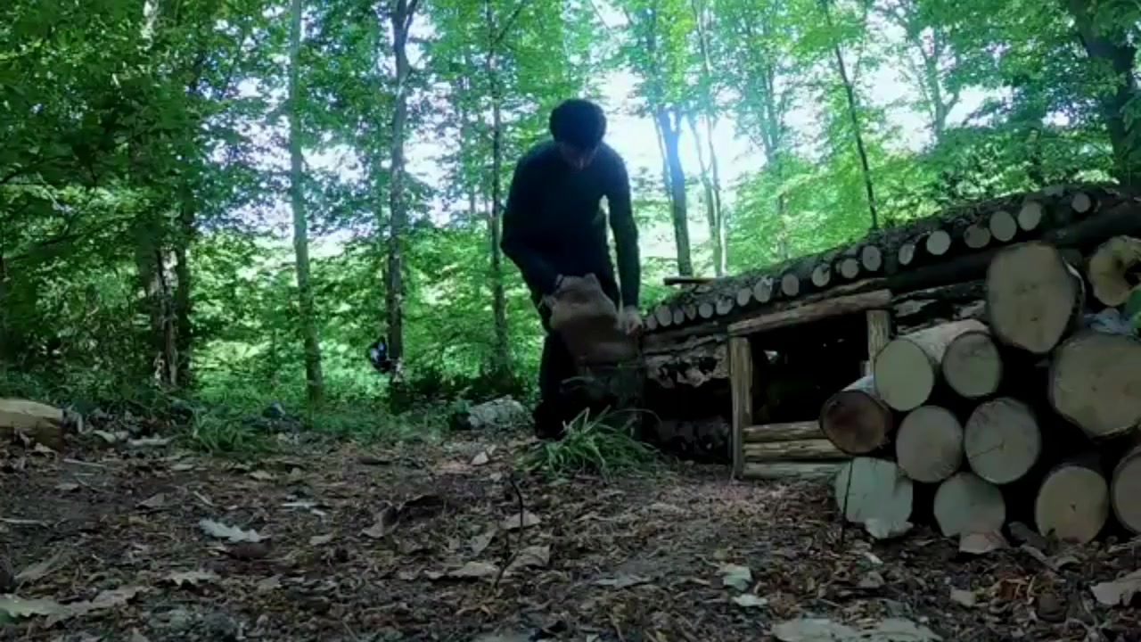 کمپینگ بوشکرفت و ساخت کلبه چوبی و گلی اسرار آمیز و نفس گیر در جنگلهای رو به پاییز شمالی کباب ران گوساله روی سیخ گردان بر روی آتش هیزمی پخت دمنوش و چای روی هیزم
