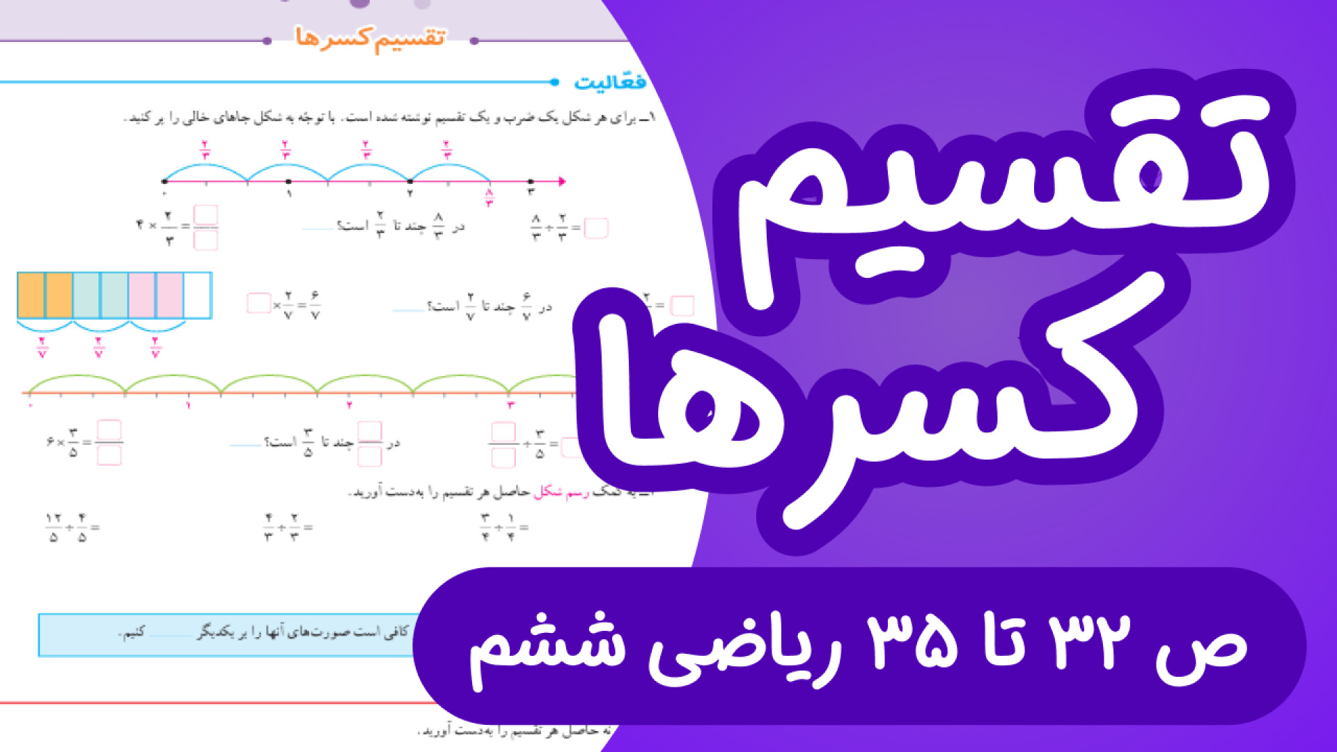با دیدن این ویدیو تمام تمرینات مبحث تقسیم کسرها رو میتونید حل کنید. پس با دقت به توضیحات خانم رحمانی گوش بدین. این سومین مبحث از فصل دوم هستش که شامل صفحات 32 تا 35 کتاب ریاضی ششم میشه. امیدواریم از این مدل ویدیوها استفاده کرده باشین. هر سوال یا نظری داشتین حتما بهمون بگین و یادتون نره که کانال مدرسه رو دنبال کنین تا سریع تر ویدیوهای دلخواهتون رو پیدا کنین.