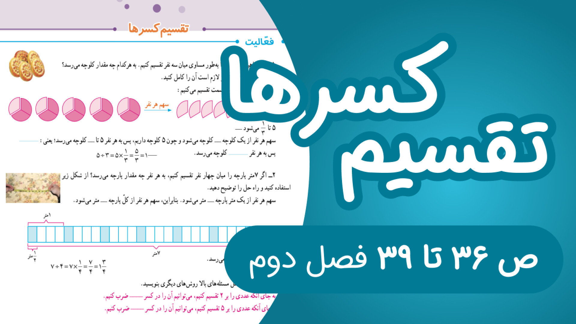 با دیدن این ویدیو تمام تمرینات مبحث تقسیم کسرها رو میتونید حل کنید. پس با دقت به توضیحات خانم صفدری گوش بدین. این چهارمین مبحث از فصل دوم هستش که شامل صفحات 36 تا 39 کتاب ریاضی پنجم میشه. امیدواریم از این مدل ویدیوها استفاده کرده باشین. هر سوال یا نظری داشتین حتما بهمون بگین و یادتون نره که کانال مدرسه رو دنبال کنین تا سریع تر ویدیوهای دلخواهتون رو پیدا کنین.