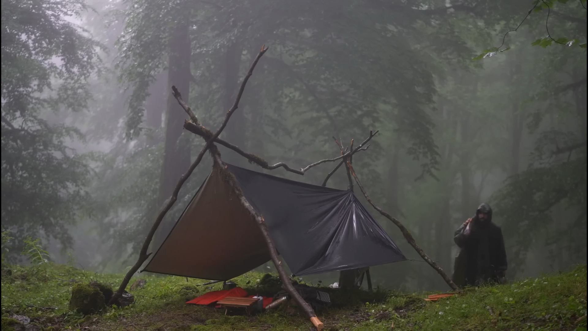 بعد از یک پیادهروی طولانی در جنگل مهگرفته و باران سنگین، به محل کمپ رسیدم و بلافاصله شروع کردم به نصب یک پناهگاه با تارپ برزنتی بین درختان. پس از آماده شدن پناهگاه، یک آتشگاه با چهار سنگ بزرگ درست کردم تا از باران محافظت شود. سپس نوبت به جمعآوری هیزم از جنگل رسید. کمپینگ در باران شدید و طوفان، پس از مدتها، برایم فوقالعاده لذتبخش بود