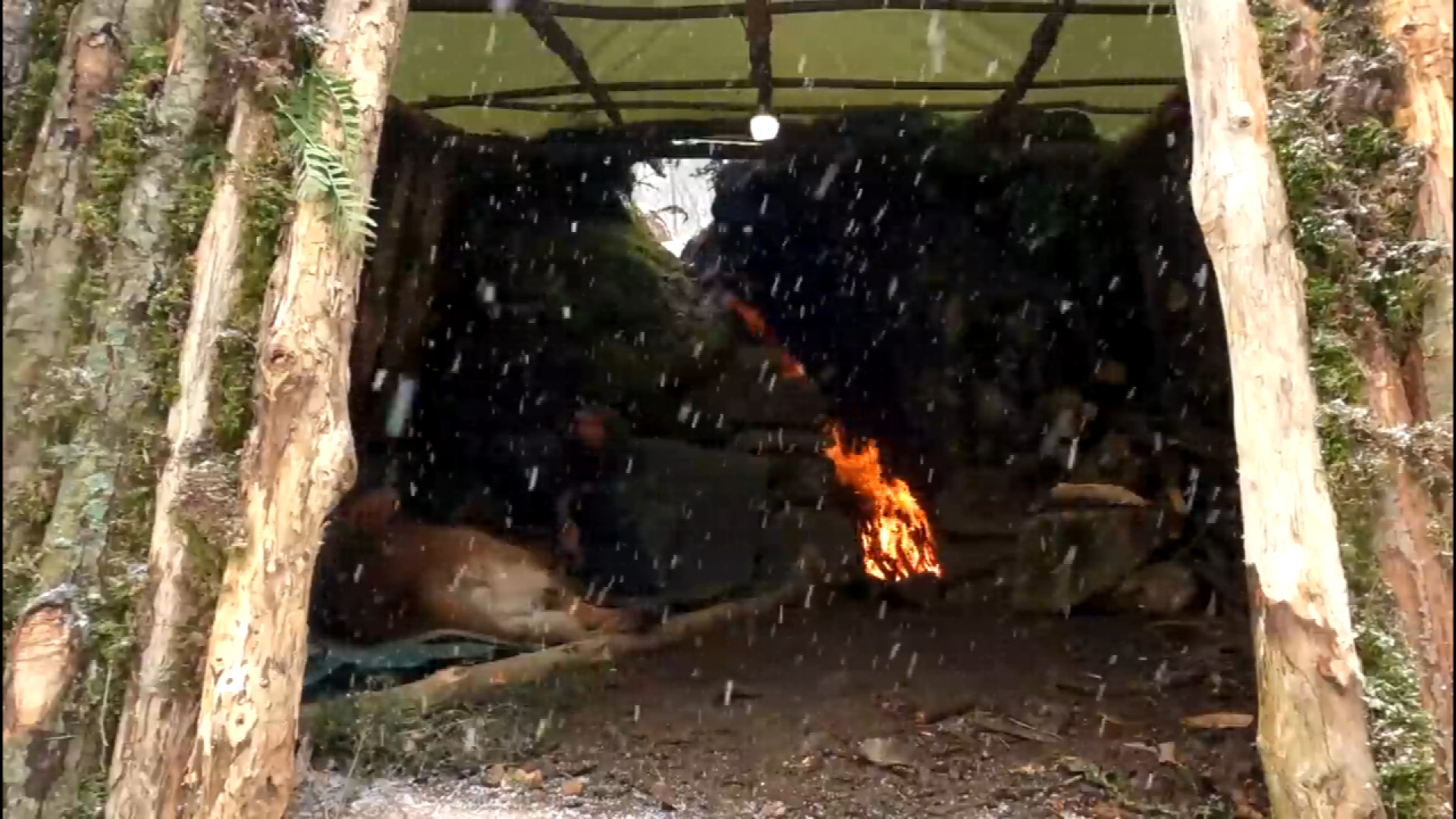 کمپینگ بوشکرفت در اعماق جنگلهای برفی و اقامت در یک کلبه چوبی جنگلی با سگم برپایی آتش هیزمی آشپزی جنگلی و کباب استیک گوشت گوساله