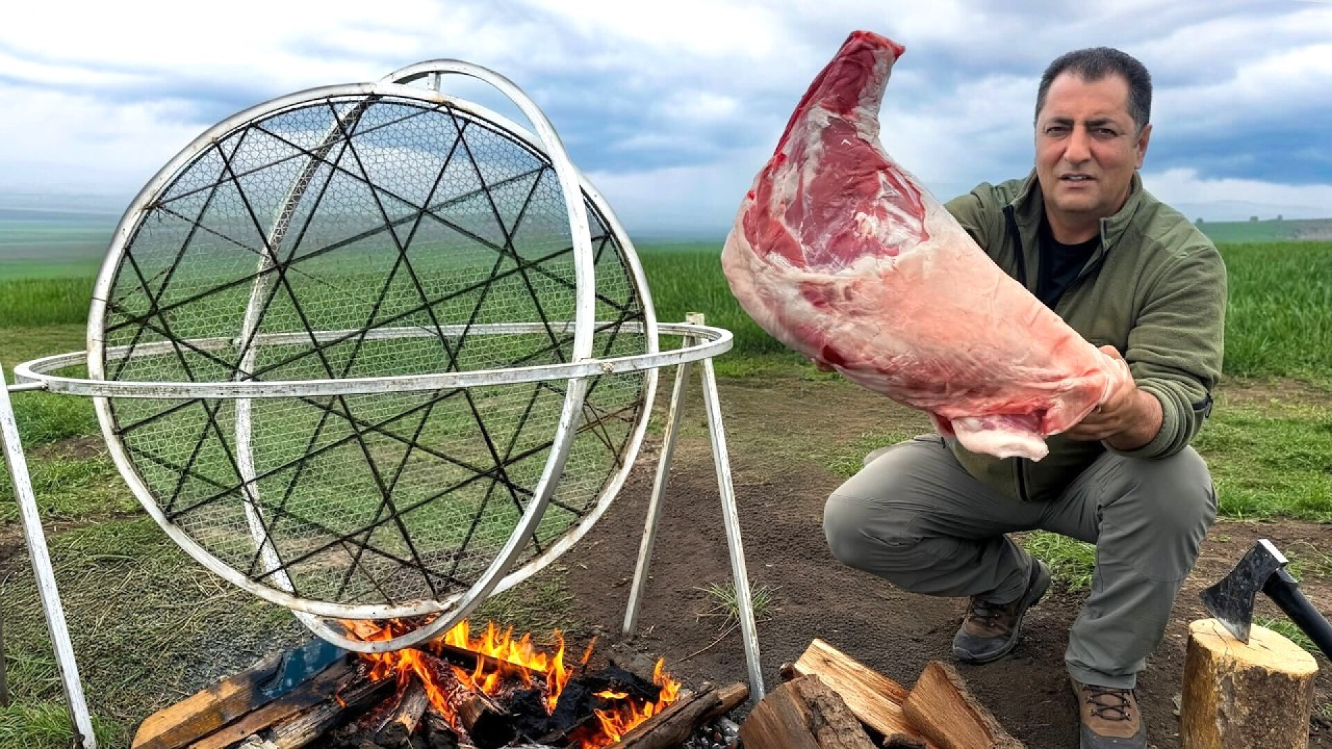 آشپزی در طبیعت پخت گوشت روی کباب پز ژیروسکوپی