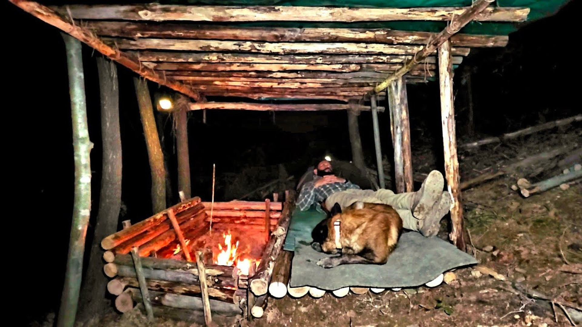 کمپینگ بقا و ساخت پناهگاه چوبی بوشکرفت در اعماق جنگلهای شمال به همراه سگم پخت گوشت قرمز گوساله بر روی هیزم