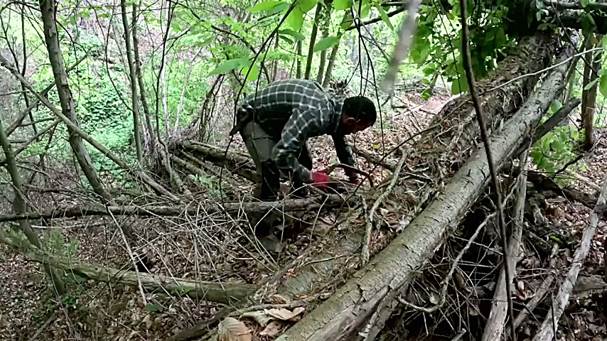 کمپینگ بوشکرفت و ساخت پناهگاه با تنه درختان افتاده در جنگل به همراه سگم آشپزی در طبیعت و پخت گوشت قرمز بر روی آتش هیزمی