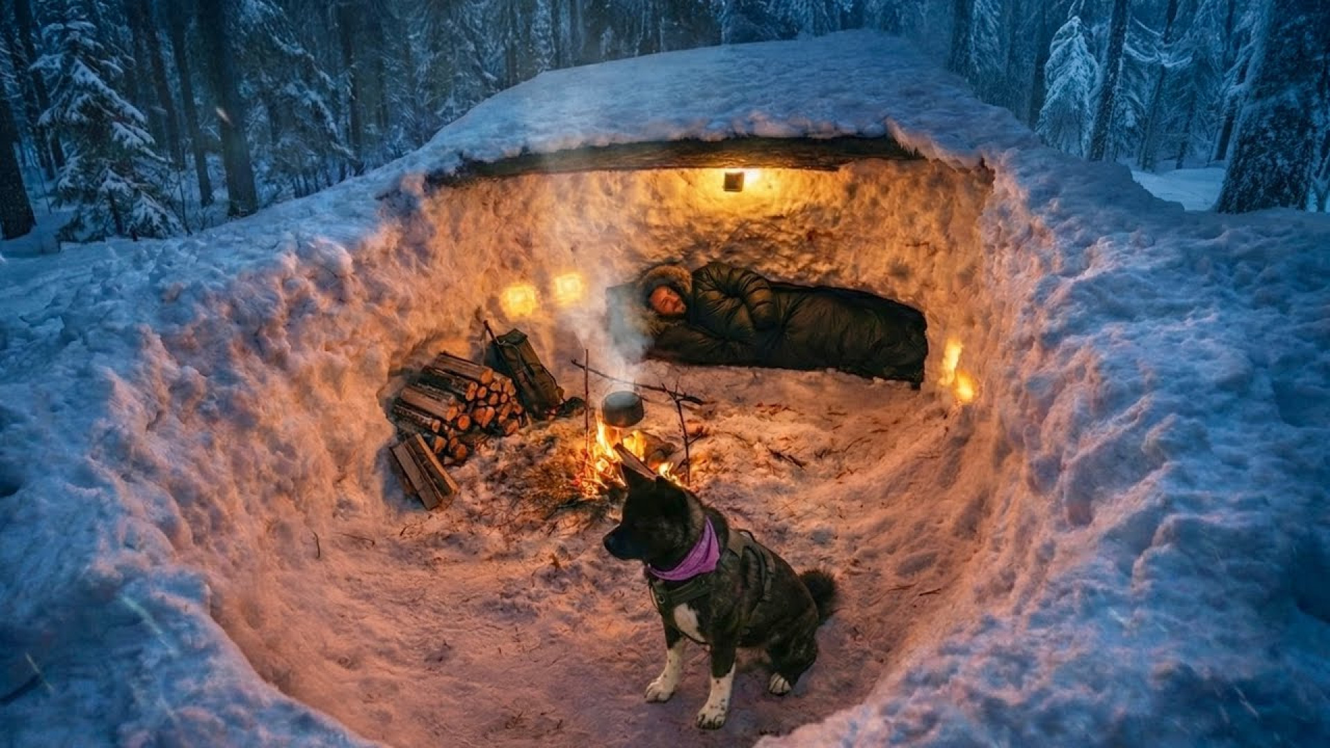 کمپینگ بوشکرفت و ساخت پناهگاهی با کندن تونل در دل برف و استفاده از شاخه درختان پوسیده به عنوان سقف در اعماق جنگلهای یخ زده زمستانی به همراه سگم شیدو آشپزی در طبیعت و کباب شیشلیک گوسفندی