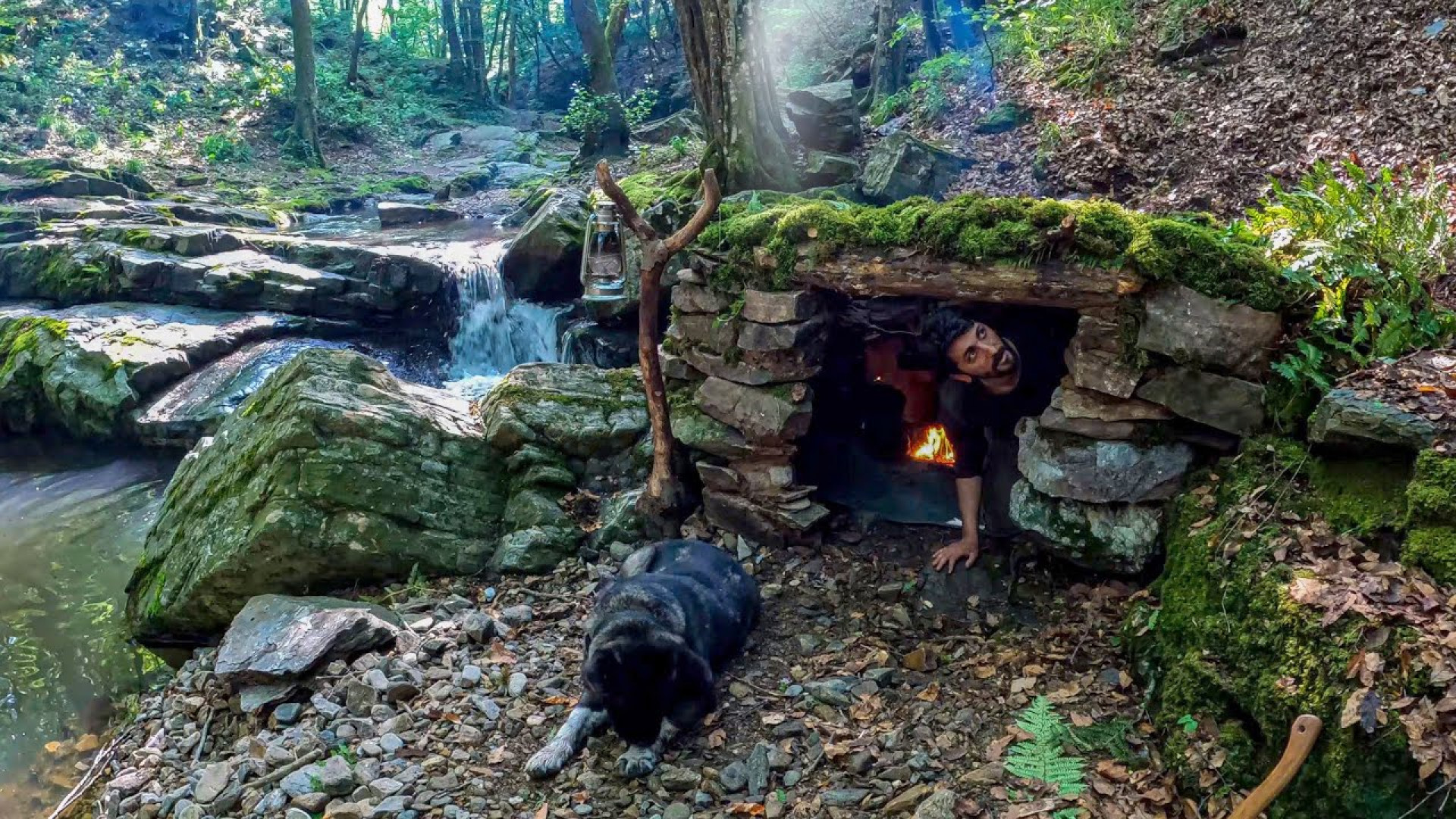 کمپینگ و ساخت کلبه بوشکرفتی چوبی و سنگی در جنگل به همراه سگم شیدو ساخت تنوره و برپایی آتش هیزمی آشپزی در طبیعت