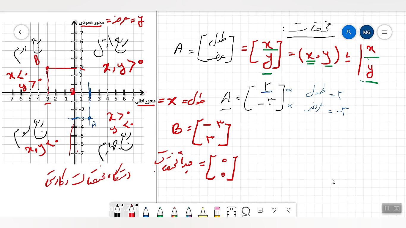 در این ویدئو، ۱) روش نامگذاری بردارها را توضیح دادم، ۲) تعریف بردارهای همراستا و بردارهای هماندازه و بردارهای برابر و دو بردار قرینه را با مثالهایی بیان کردم و چند تمرین نمونه حل کردم، ۳) جمع متناظر با بردار (یعنی ارتباط بین مختصات ابتدای بردار و مختصات بردار و مختصات انتهای آن، و همچنین ارتباط بین مختصات نقطهٔ اصلی و مختصات بردار انتقال و مختصات نقطهٔ انتقالیافته) را همراه با حل چند مثال، شرح دادم.
