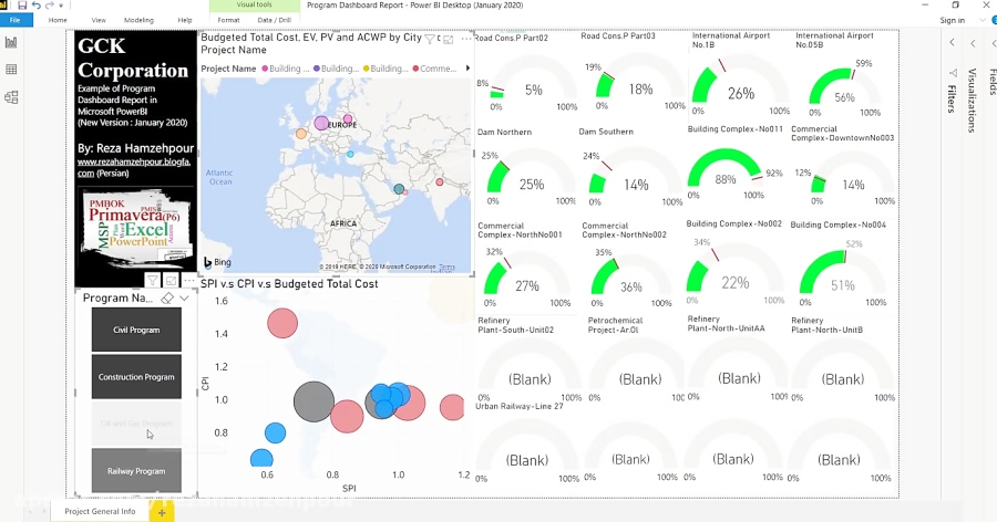 ساخت گزارش داشبورد نمونه مربوط به یک سازمان پروژه محور شامل 20 پروژه فرضی در کشورهای مختلف دنیا و در زمینه های مختلف با استفاده از Microsoft PowerBI. جهت دیدن مطالب بیشتر در زمینه مدیریت پروژه و نیز برنامه ریزی و کنترل پروژه لینک زیر را دنبال کنید:rezahamzehpour.blogfa.com