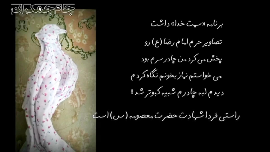 ... چادر سرم بود و می خواستم نماز بخونم برنامه سمت خدا داشت تصاویر حرم امام رضا ع رو پخش می کرد ناگهان چشمم به لبه چادرم افتاد که روی زمین دقیقا شبیه یک کبوتر شده بود از لبه چادر عکس گرفتم ... همون لحظه یادم افتاد که فردا شهادت حضرت معصومه س است! ... (این اتفاق در سال 96 دقیقا همینطوری رخ داد! بدون اینکه کوچکترین تغییری در لبه چادر بدهم از این کبوتر عکس گرفتم!)